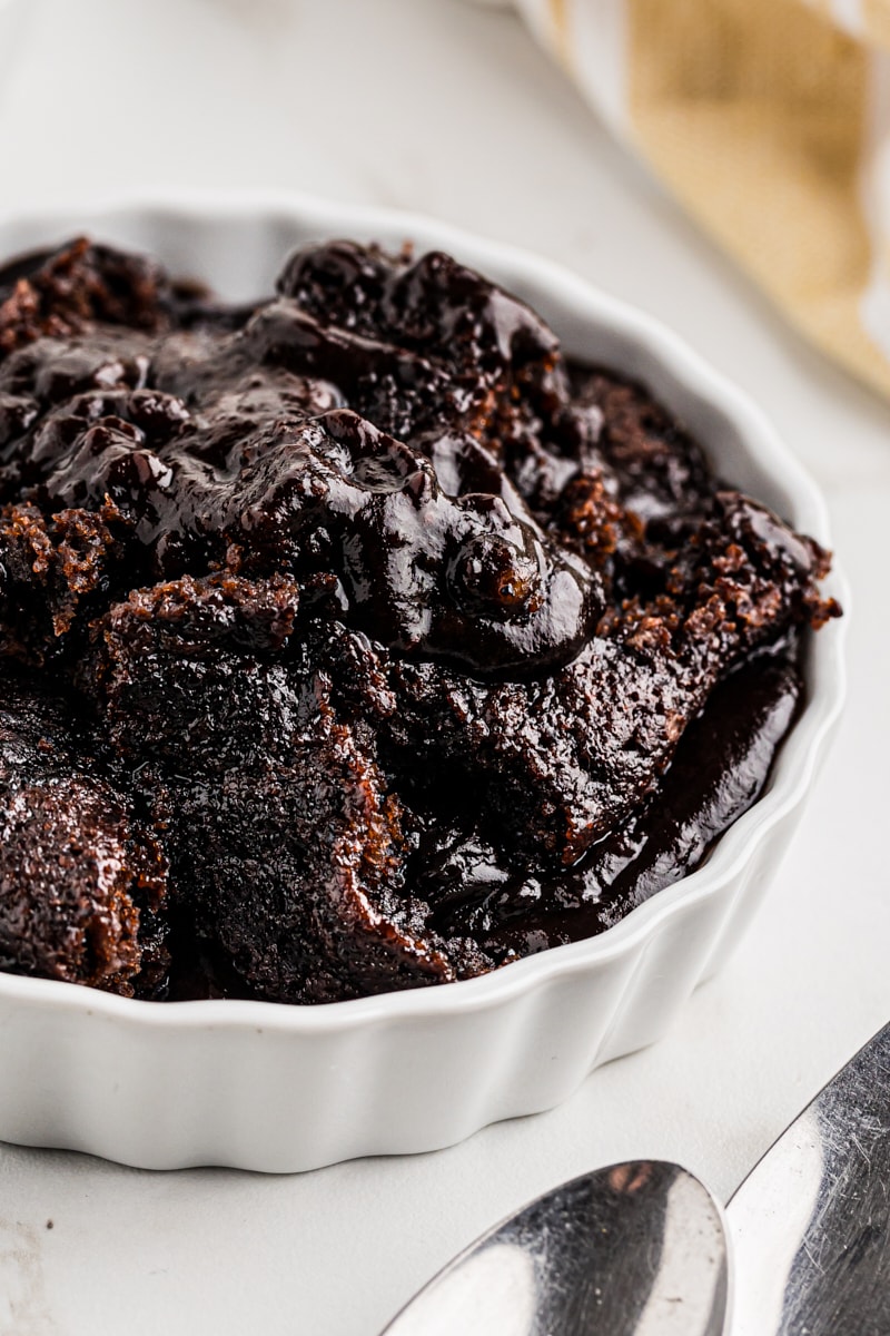 - Soft, gooey, and rich. As it bakes, the batter separates into a tender cake on top and a warm chocolate sauce underneath — like a richer, more indulgent pudding cake.