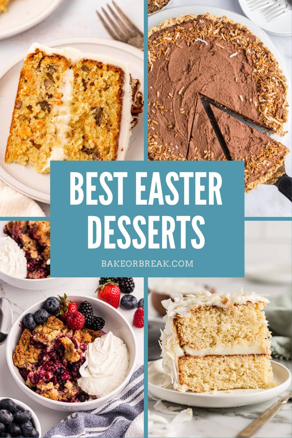 Not sure what to make? Choose a classic carrot cake if you’re leaning traditional, a coconut layer cake or chocolate torte for a standout centerpiece, or a bright lemon or berry dessert for something lighter and spring-inspired.