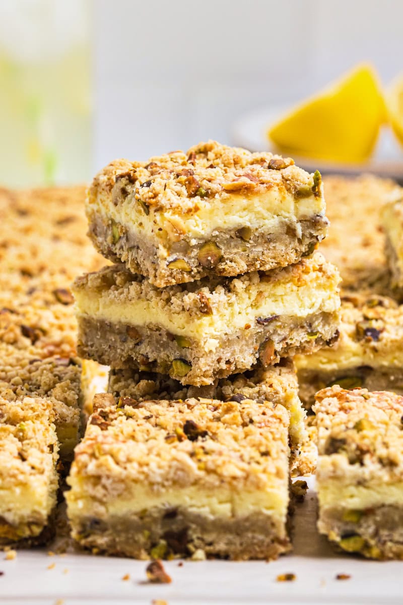 lemon pistachio cheesecake bars with crumb topping stacked on a white surface