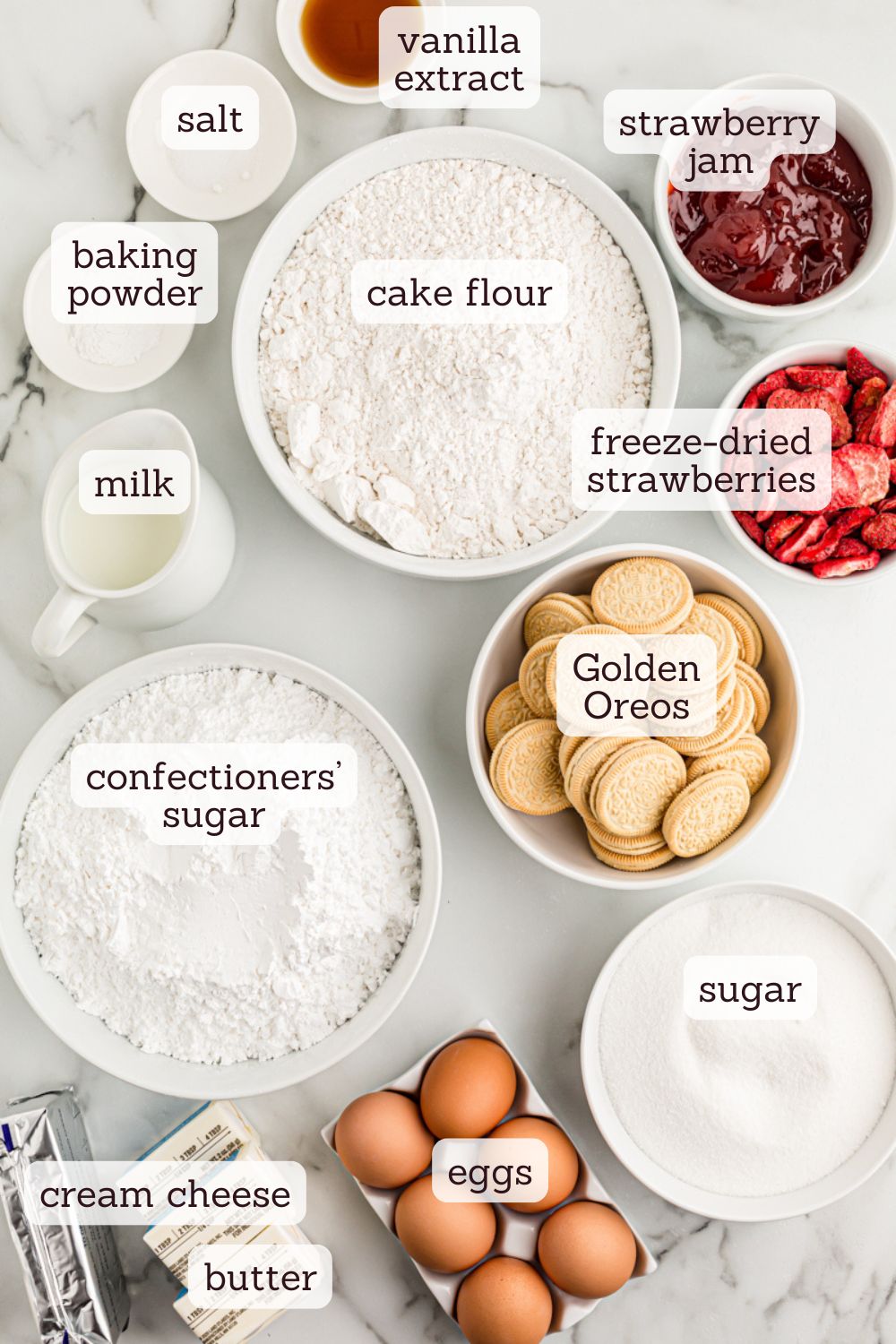 - Unsalted butter, milk, eggs, sugar, vanilla, baking powder, salt – Baking staples that round out the cake base.