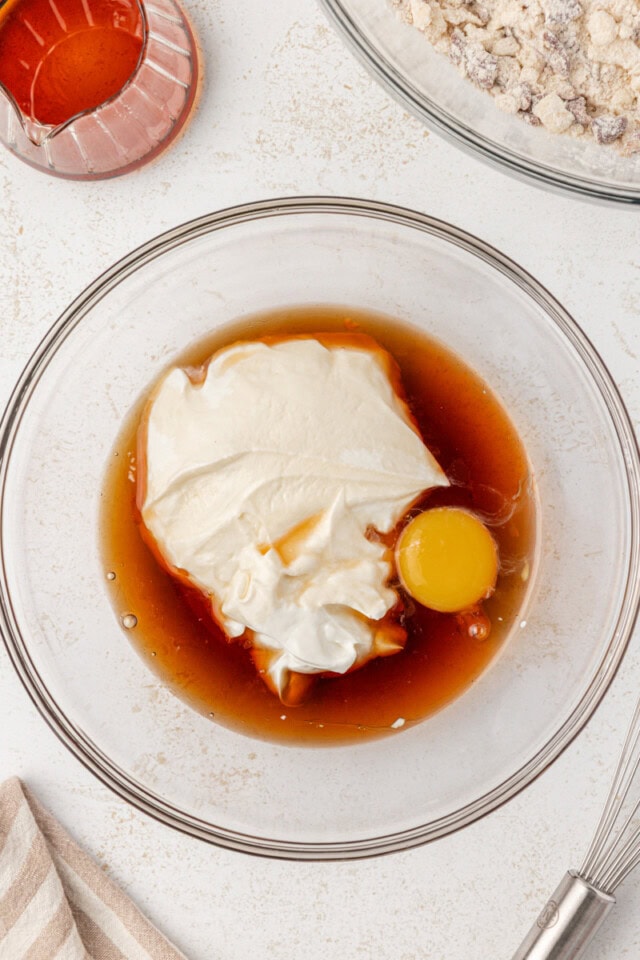 In a separate bowl, mix the Greek yogurt, egg yolk, maple syrup, and optional maple extract. The extract boosts the flavor, especially if your syrup is on the mild side.