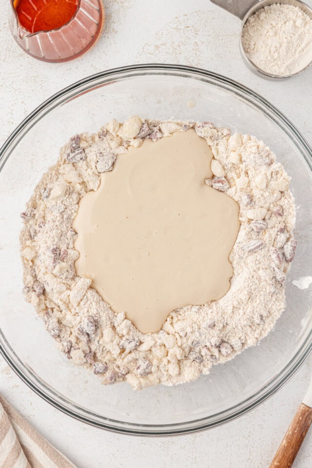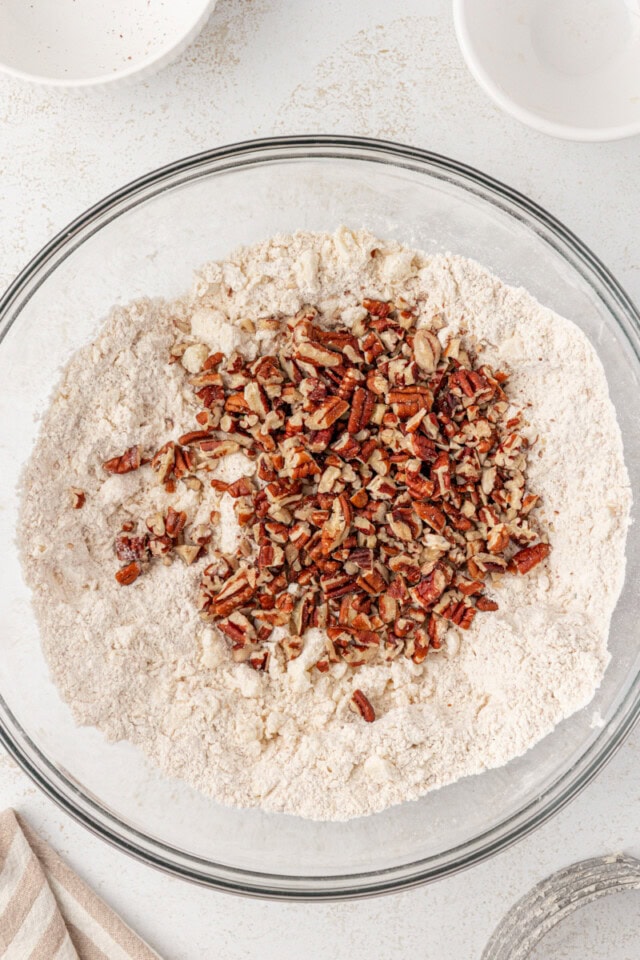 Stir in the chopped pecans so they’re evenly dispersed before adding any moisture.