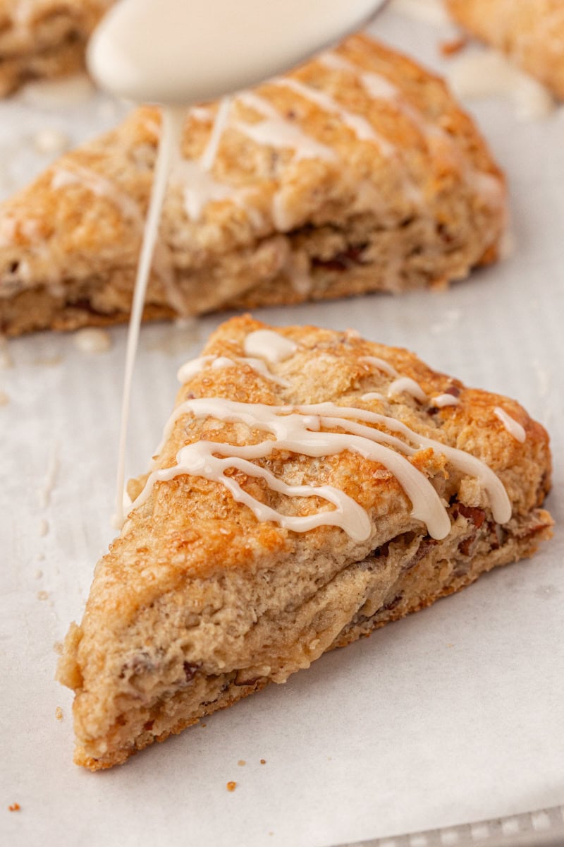 Let the scones cool slightly, then drizzle with maple glaze while they’re still a bit warm so it settles in nicely without melting completely.