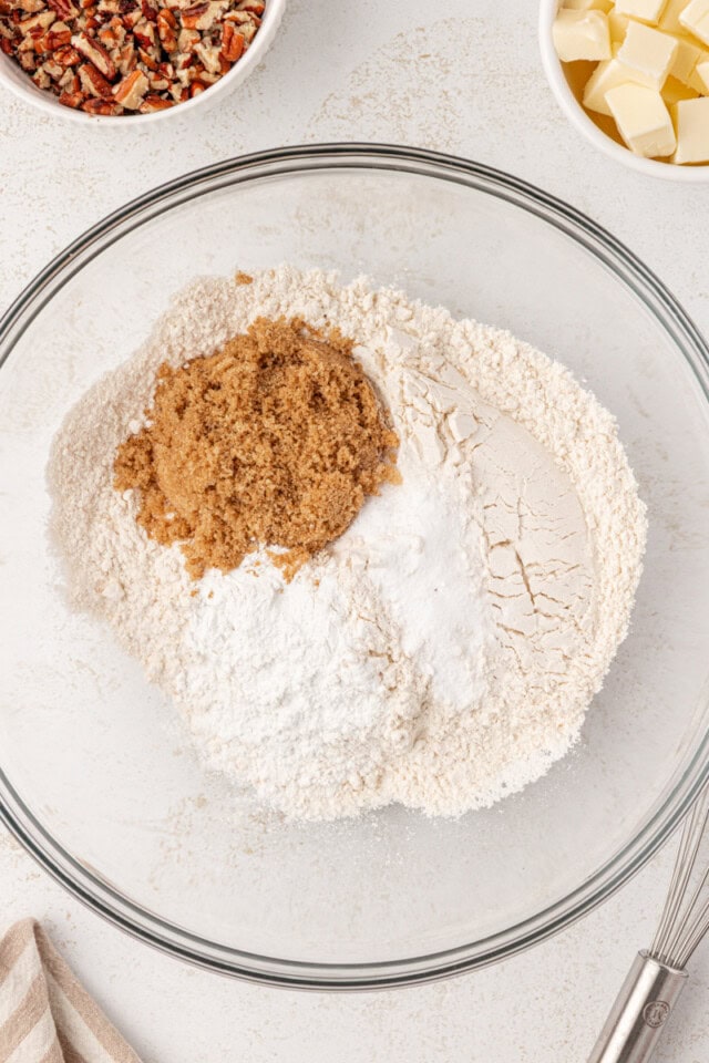 Start by whisking together the flour, brown sugar, baking powder, baking soda, and salt. This ensures everything is evenly distributed before adding the butter.