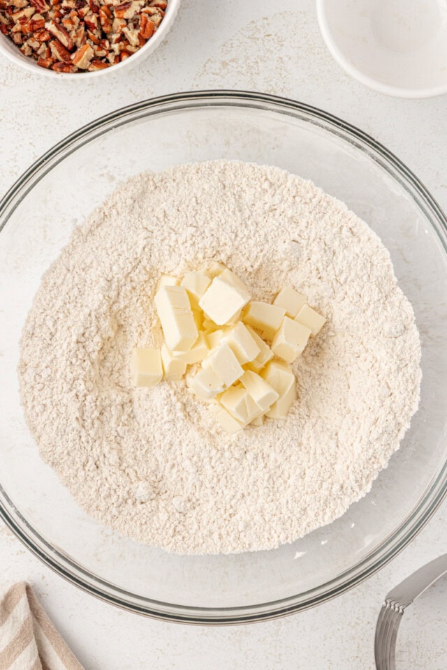 - Cut in the cold butter with a pastry blender, a fork, or your fingers until the mixture resembles coarse meal. Stir in the chopped pecans.